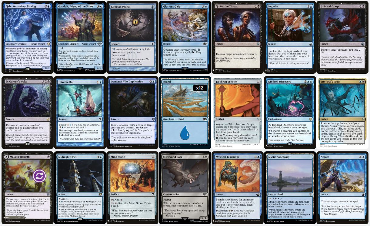 This Dimir deck floods the board with 3/3 menace Wraiths every time you cast a spell. Protect them, copy your commander, and control the board with efficient instants until you hit nine Wraiths—then crush your enemies with a sudden swarm of 9/9s.
