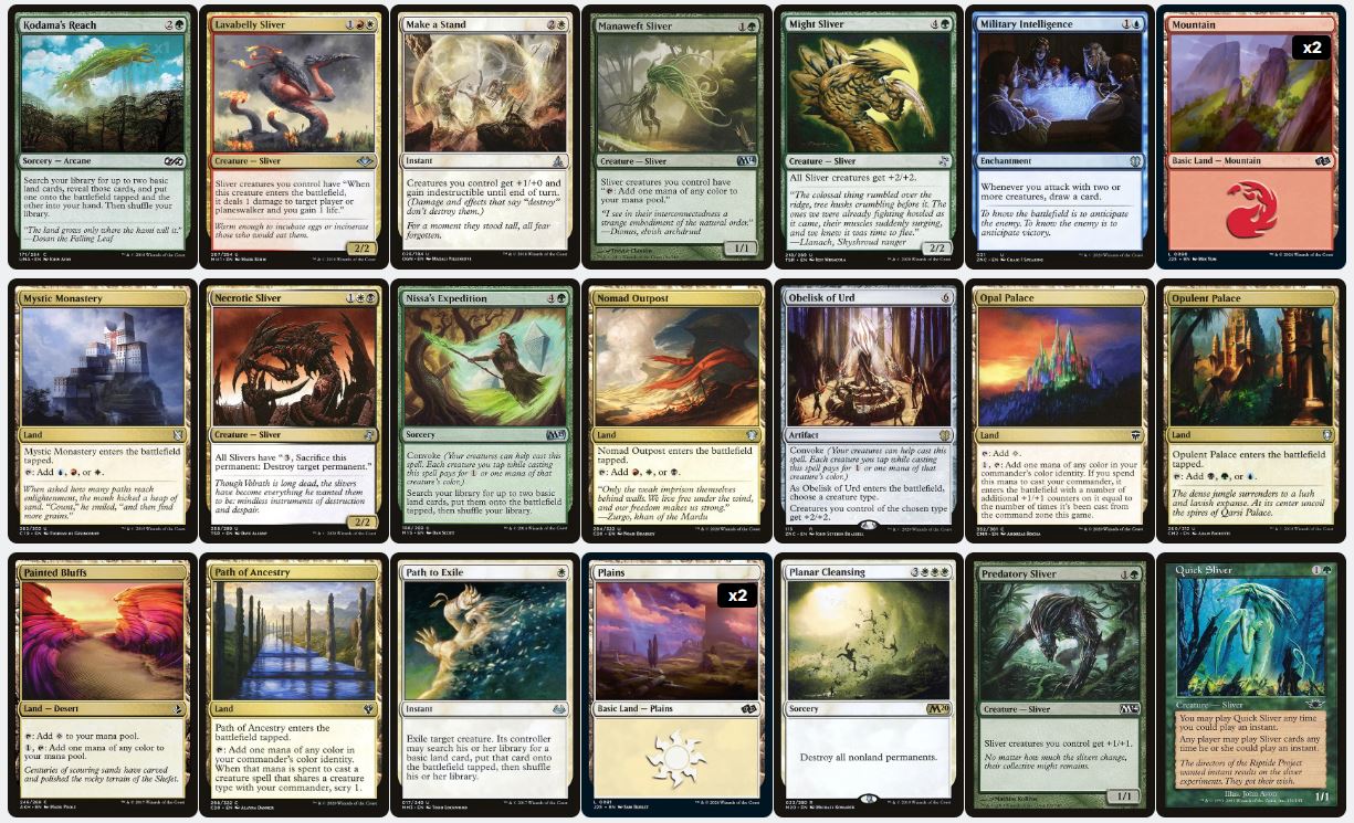 Slivers unite! This 5-colour deck assembles a deadly legion of synergistic Slivers, all made indestructible by your commander. Ramp fast, flood the board with versatile tribal creatures, and overwhelm opponents with power, evasion, and utility.